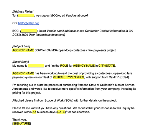 Send your SOW to vendors. We recommend sending the SOW to all MSA-awarded vendors using our email template. Their up-to-date contact information can be found in the MSA User Instructions document (vendor links: Connexionz Ltd↗, Passio Technologies LLC↗, Swiftly Inc↗)