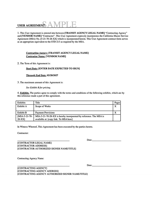 Once you’ve selected the winning proposal, you and the MSA vendor must execute a User Agreement including the SOW, agreed pricing, and referencing the MSA terms. You can use a Standard Agreement such as STD 213 for DGS↗ or Sample User Agreement.