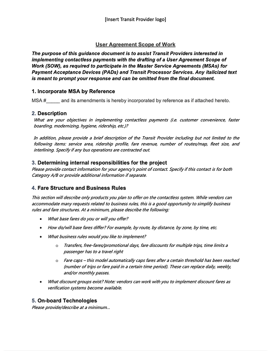 Creating a clear, focused SOW will ensure vendors understand your needs. Download and fill in our SOW template. Be sure to specify your operating goals, technical environment, and any must-have features or services. Your Cal-ITP Account Manager can offer guidance and review your SOW before sending it to vendors.